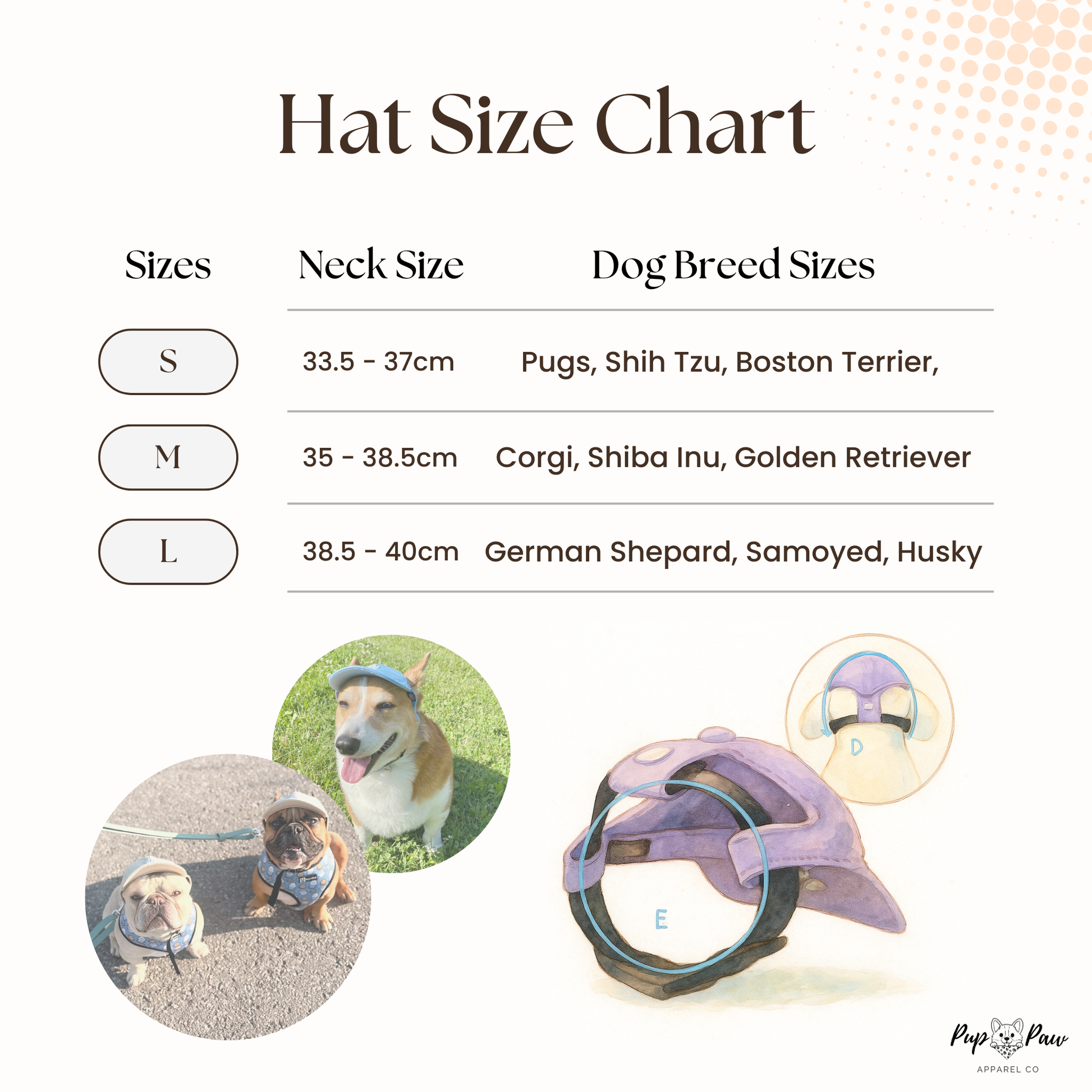 It's such a cute hat and the quality feels just like an actual baseball cap for humans. May need to try to size up on our next order from M to L as I think our shiba is in between sizes (he is also slightly bigger than your average shiba). Our friend has the same hat in size large, and it offers more space for our pups ears. Overall would definitely order again and highly recommend!